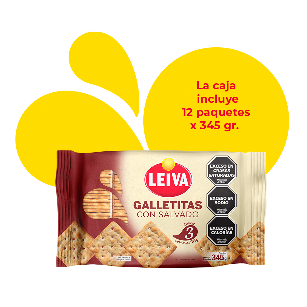 LA CAJA CONTIENE 12 PAQUETES DE GALLETITAS CON SALVADO TRIPACK LEIVA. (12 paquetes x 345 gr.)