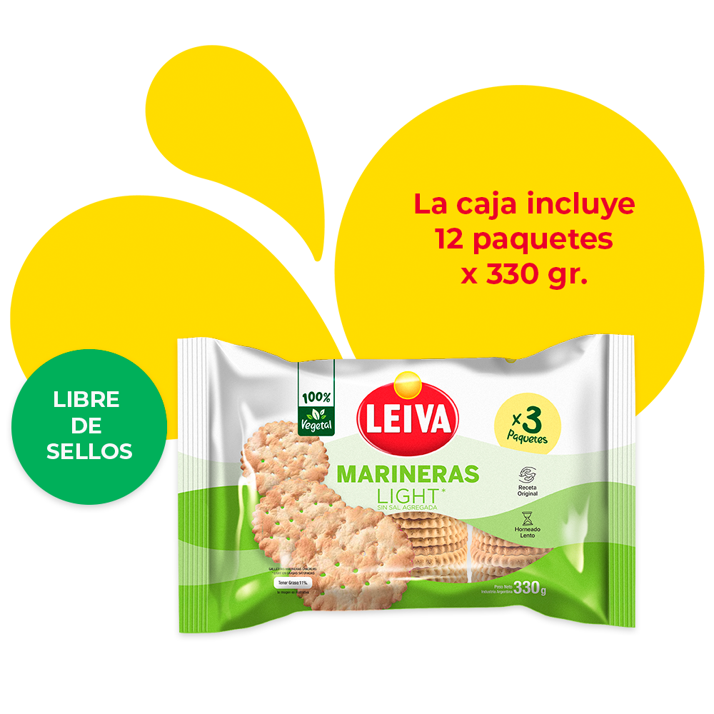 LA CAJA CONTIENE 12 PAQUETES DE GALLETITAS MARINERAS LIGHT LEIVA. (12 paquetes x 330 gr)