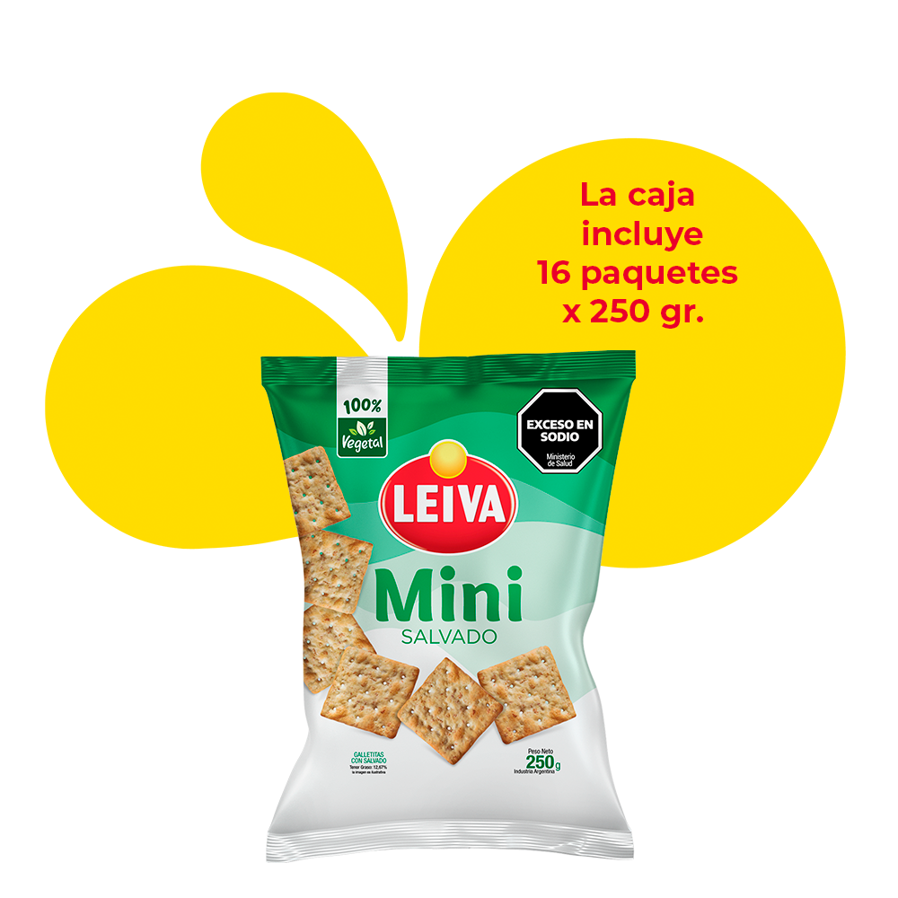 LA CAJA CONTIENE 16 PAQUETES DE MINI CRACKERS DE SALVADO LEIVA. (16 paquetes x 250 gr.)