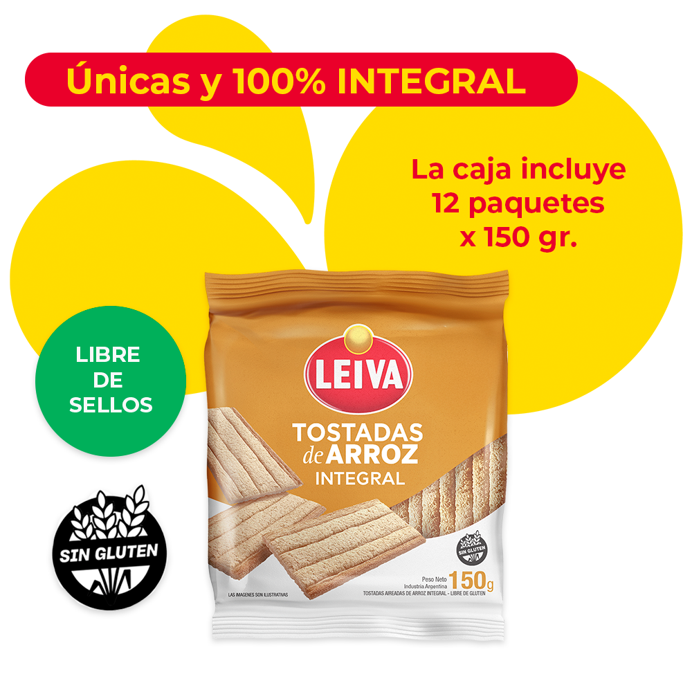 LA CAJA CONTIENE 12 PAQUETES DE TOSTADAS DE ARROZ 100% INTEGRALES LEIVA. (12 paquetes x 150 gr.)