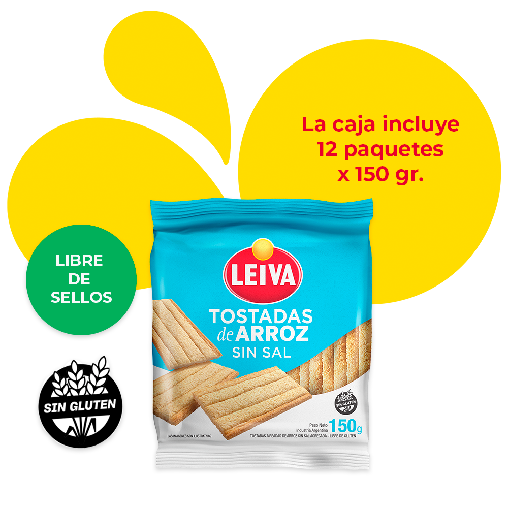 LA CAJA CONTIENE 12 PAQUETES DE TOSTADAS DE ARROZ SIN SAL AGREGADA LEIVA. (12 paquetes x 150 gr.)