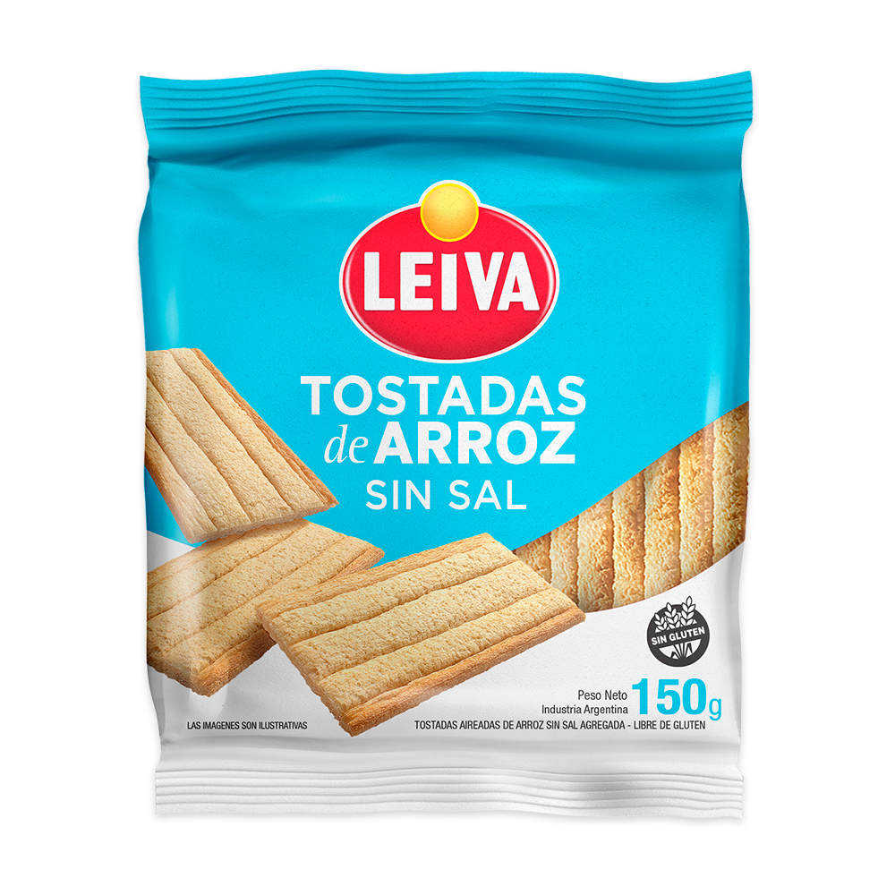 Tostadas de arroz sin sal agregada Leiva. Sin TACC, aptas para celíacos, livianas y crocantes. Ideales para dietas bajas en sodio y consumo diario.